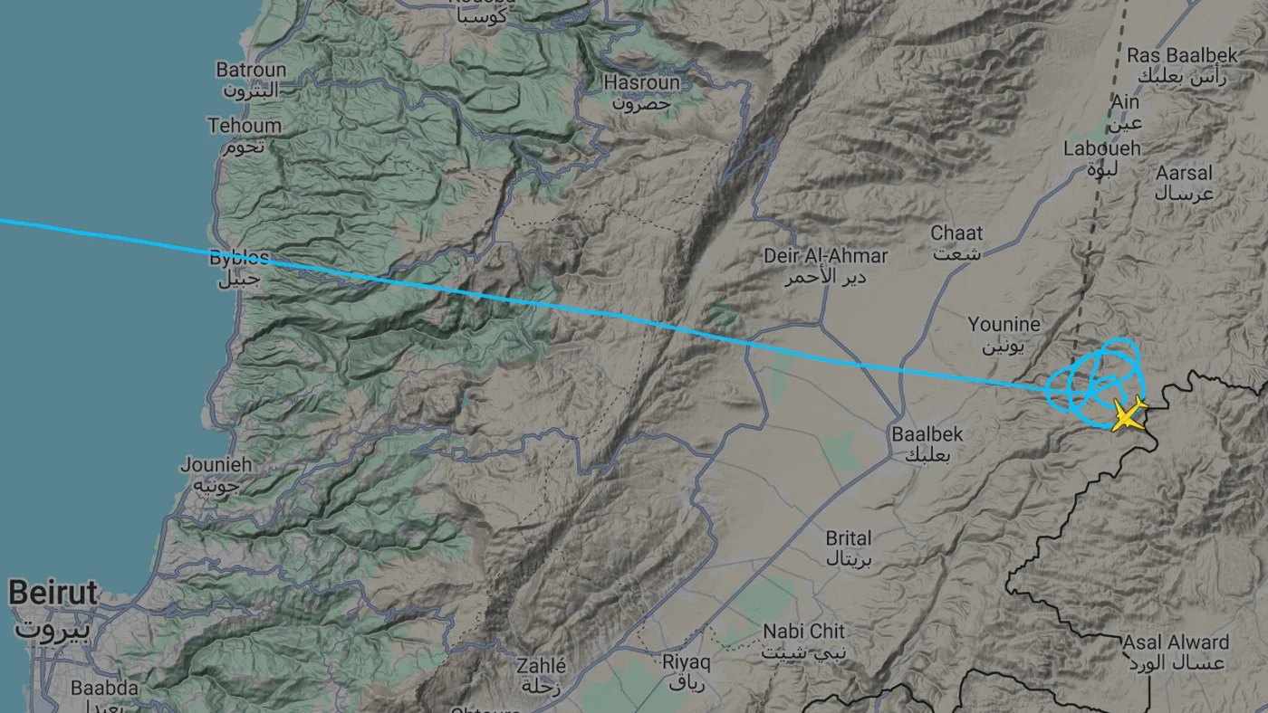 Maszyna krążyła nad obszarem w pobliżu Baalbek i miejscowości Younine we wschodnim Libanie, w rejonie granicy z Syrią, między godziną 6:30 a 6:50. Następnie, około 8:00, weszła w przestrzeń powietrzną Syrii, kierując się na północ – w stronę Hims i Idlibu.