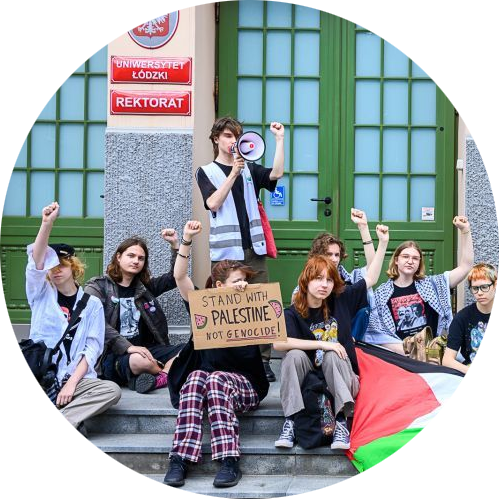 Warszawska gałąź Akademii dla Palestyny. Studenci i studentki, absolwenci i absolwentki, akademicy i akademiczki oraz osoby nauki zaangażowane w działania na rzecz wolnej Palestyny.