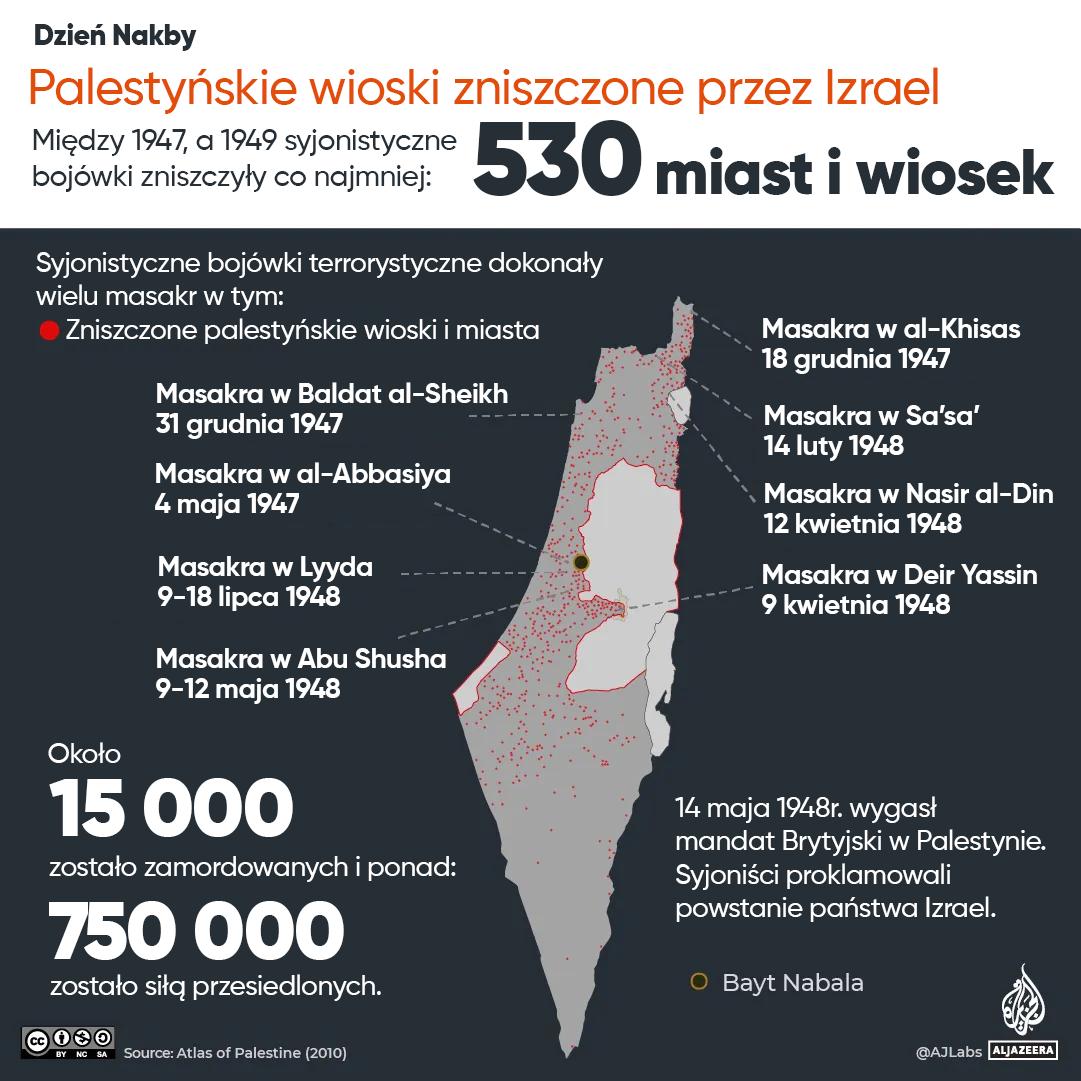 W latach 1947–1949, w czasie i tuż przed powstaniem Izraela, około 750 tysięcy Palestyńczyków zostało zmuszonych do opuszczenia swoich domów przez syjonistyczne siły zbrojne. W rezultacie zniszczono ponad 530 palestyńskich miast i wiosek.