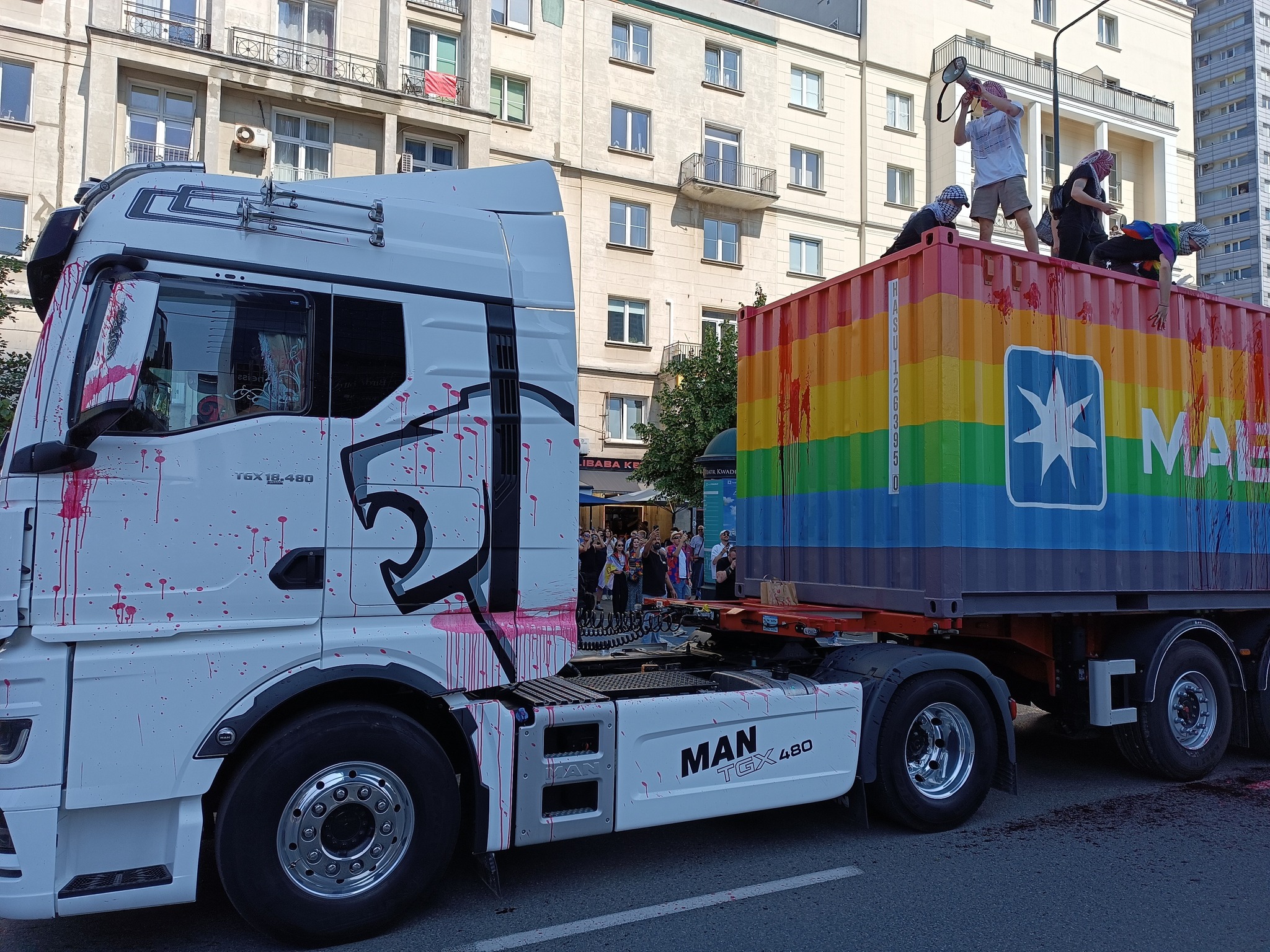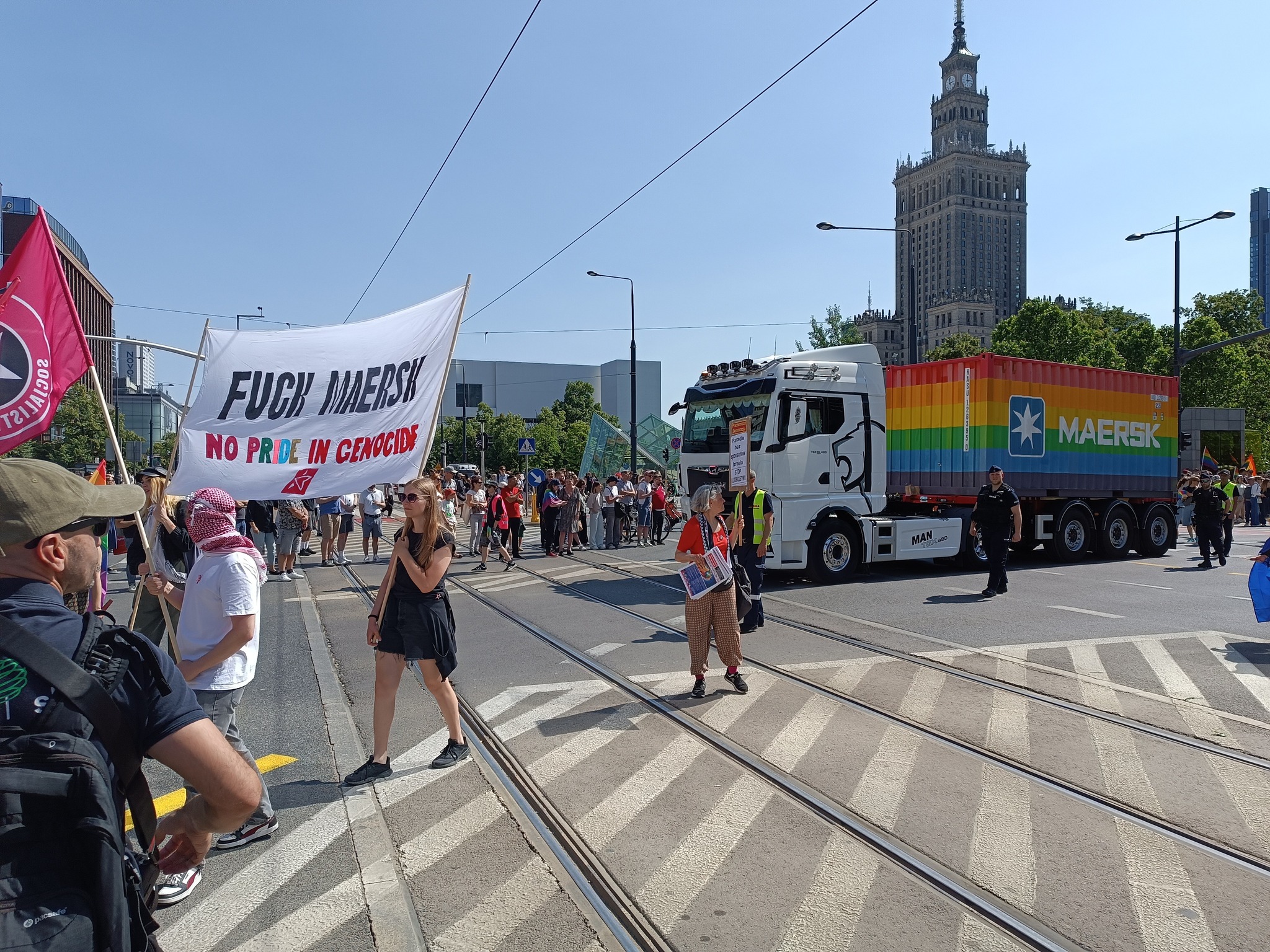 W trakcie marszu, w okolicach jednej z platform sponsorów wydarzenia, grupa kilkudziesięciu osób zorganizowała spontaniczny protest antyizraelski. Demonstranci skandowali hasła takie jak „Nie ma wolności bez wolnej Palestyny”, a sześć osób wspięło się na kontener firmy Maersk, który został oblany czerwoną farbą symbolizującą krew.